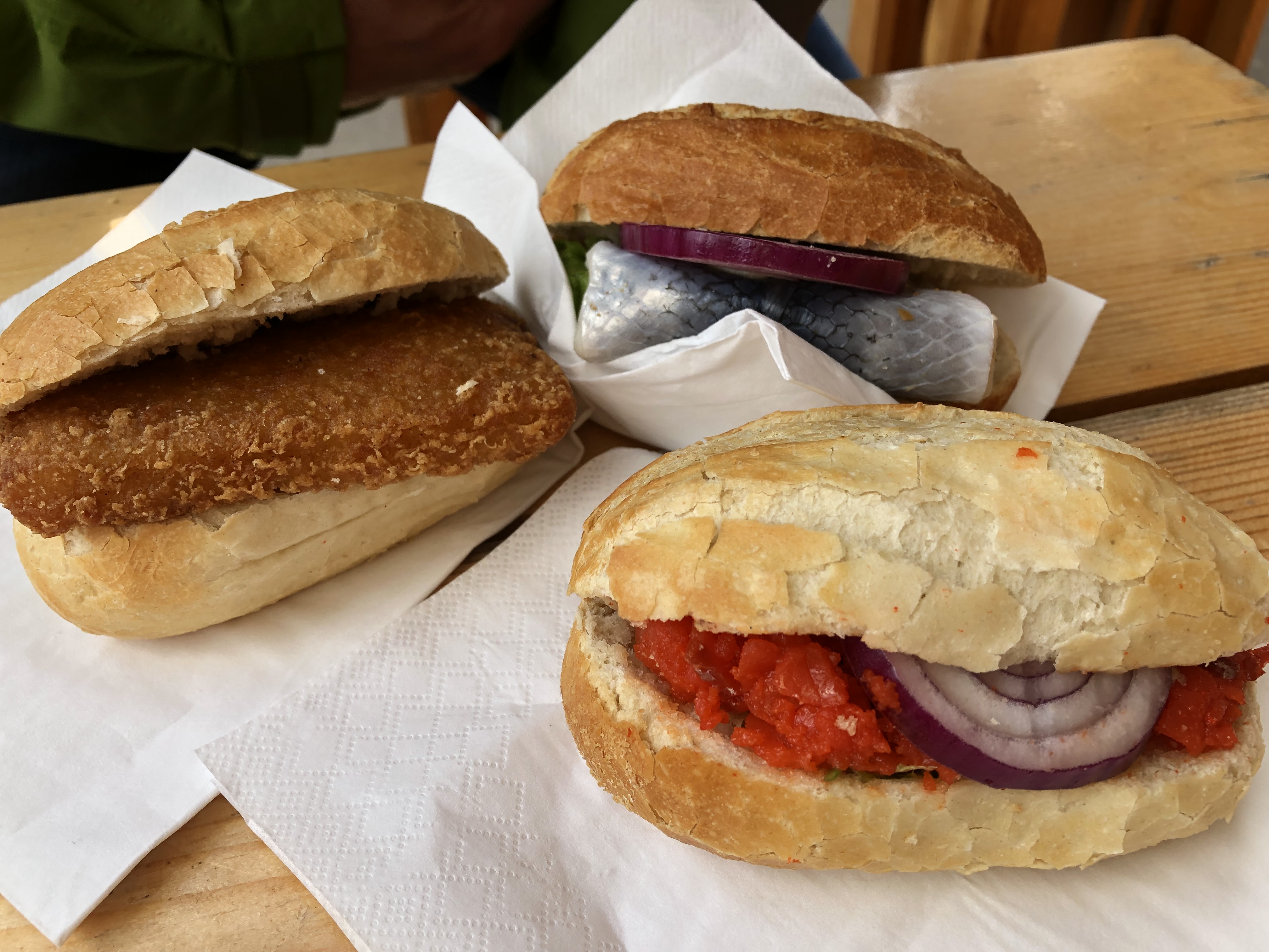 The rolls are usually made with pickled herring and white onions with extras like pickles, lettuce and remoulade sauce which is like a mayonnaise enhanced with mustard, pepper, capers etc for more zing!