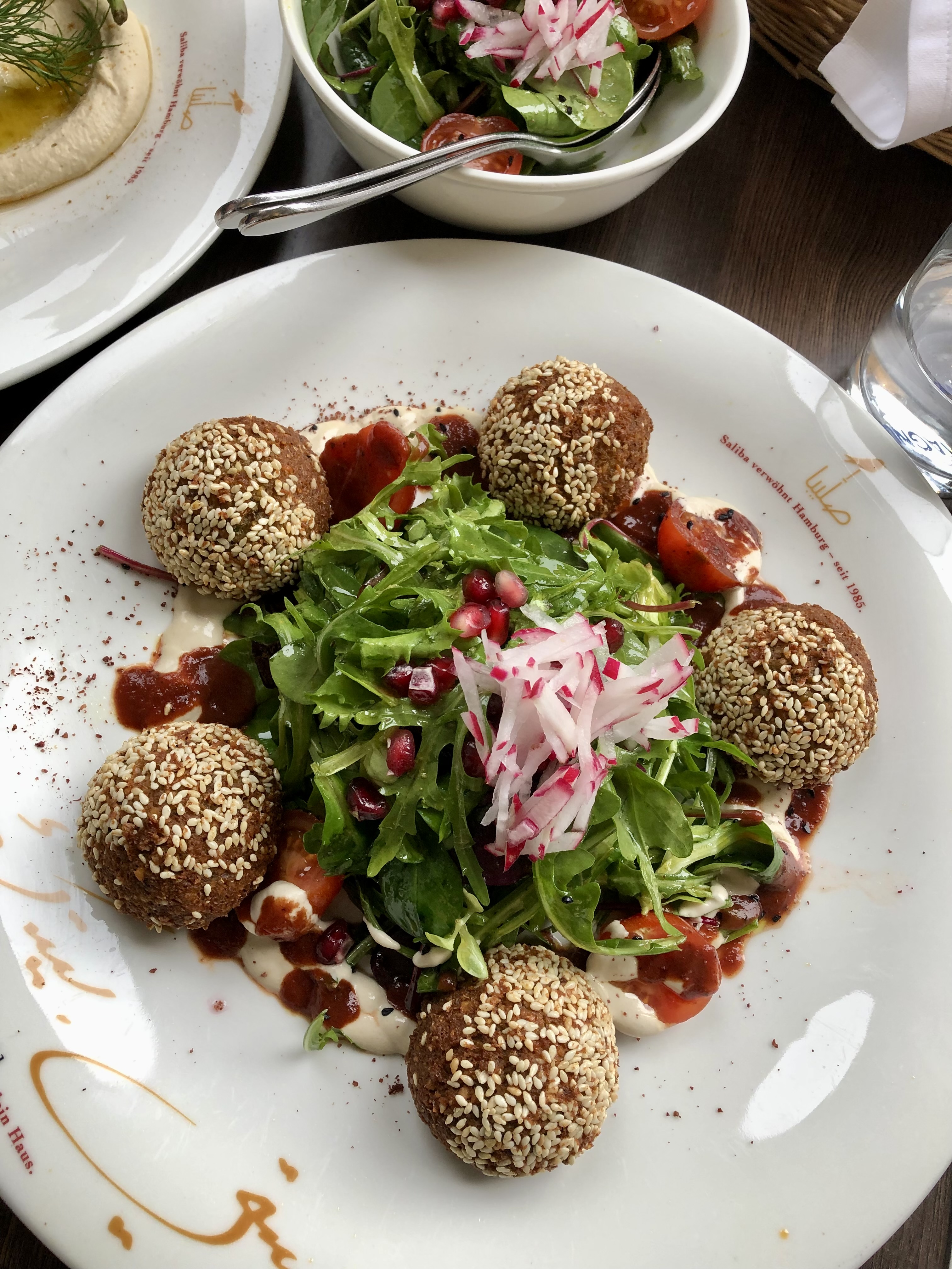 A great location under the arcades in front of the water and looking over to the Rathaus City Hall. My vegetarian dish of falafel with salad and tahini sauce was beautifully presented. We also had the chicken marinated with seven spices, served with humus. Recommended if you like Middle Eastern cuisine.