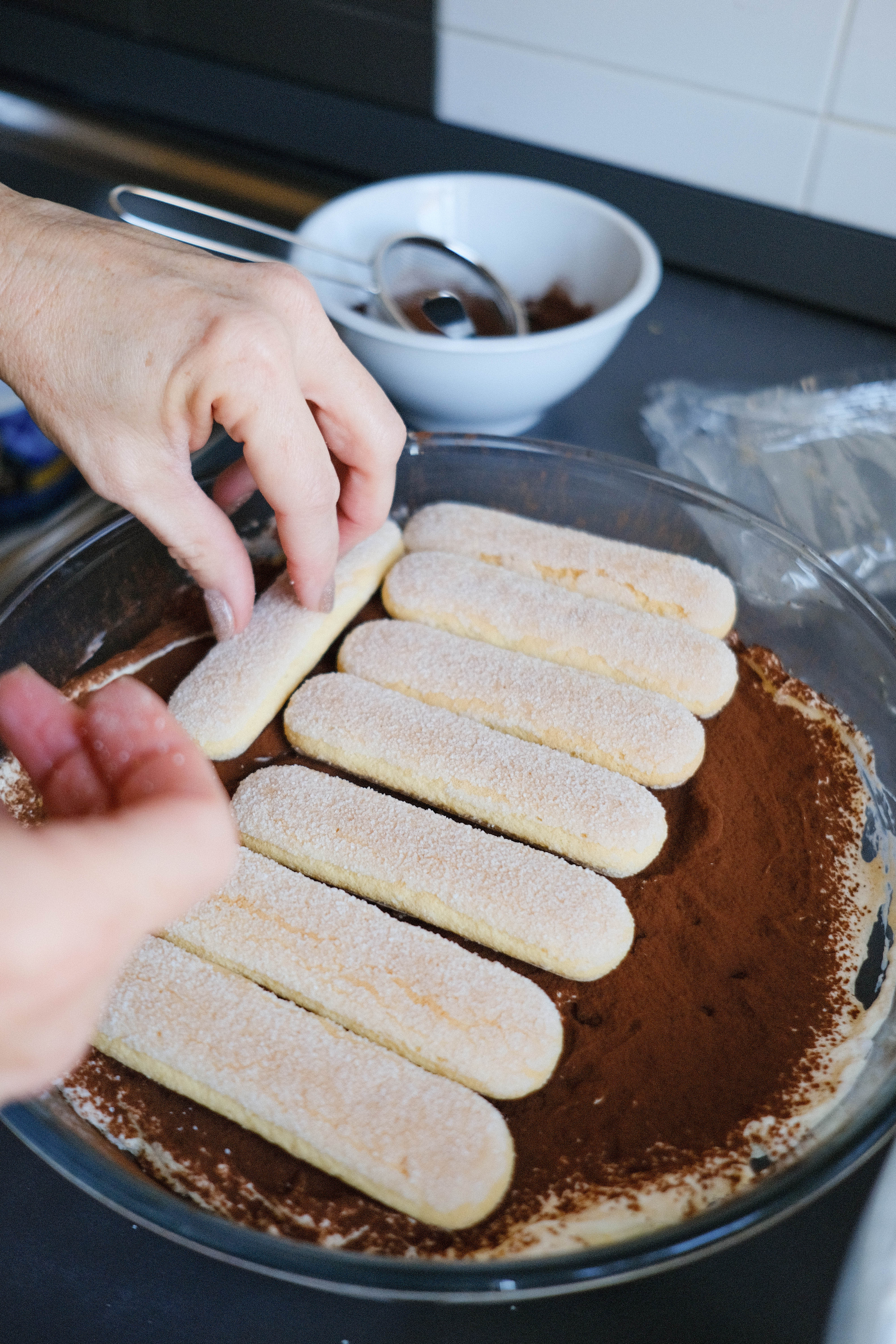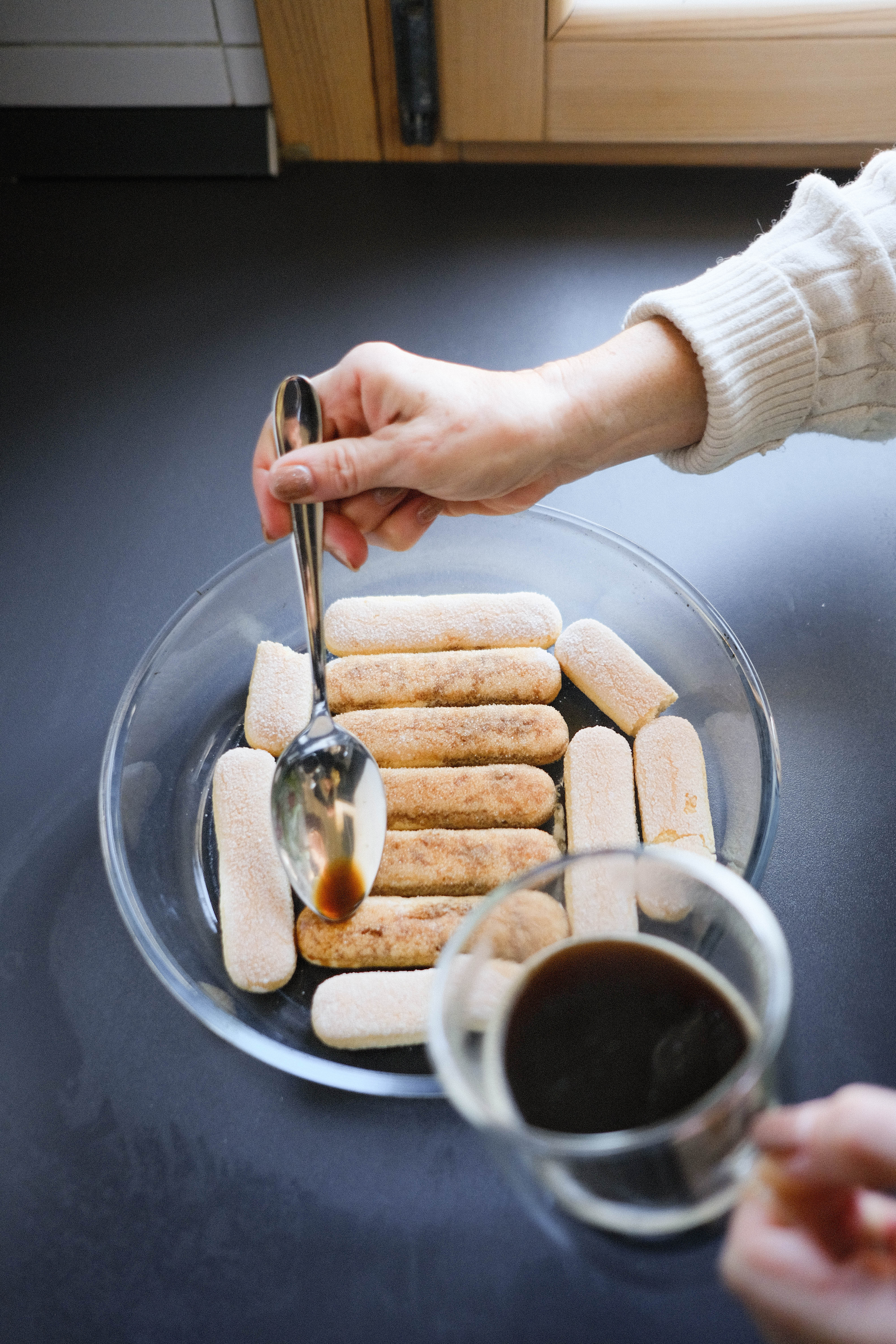 - Put a layer of savoiardi (ladyfingers) in a flat dish, snapping them into small pieces to fill any corners. Spoon the coffee over the biscuits a few times until the sponge has absorbed the liquid.