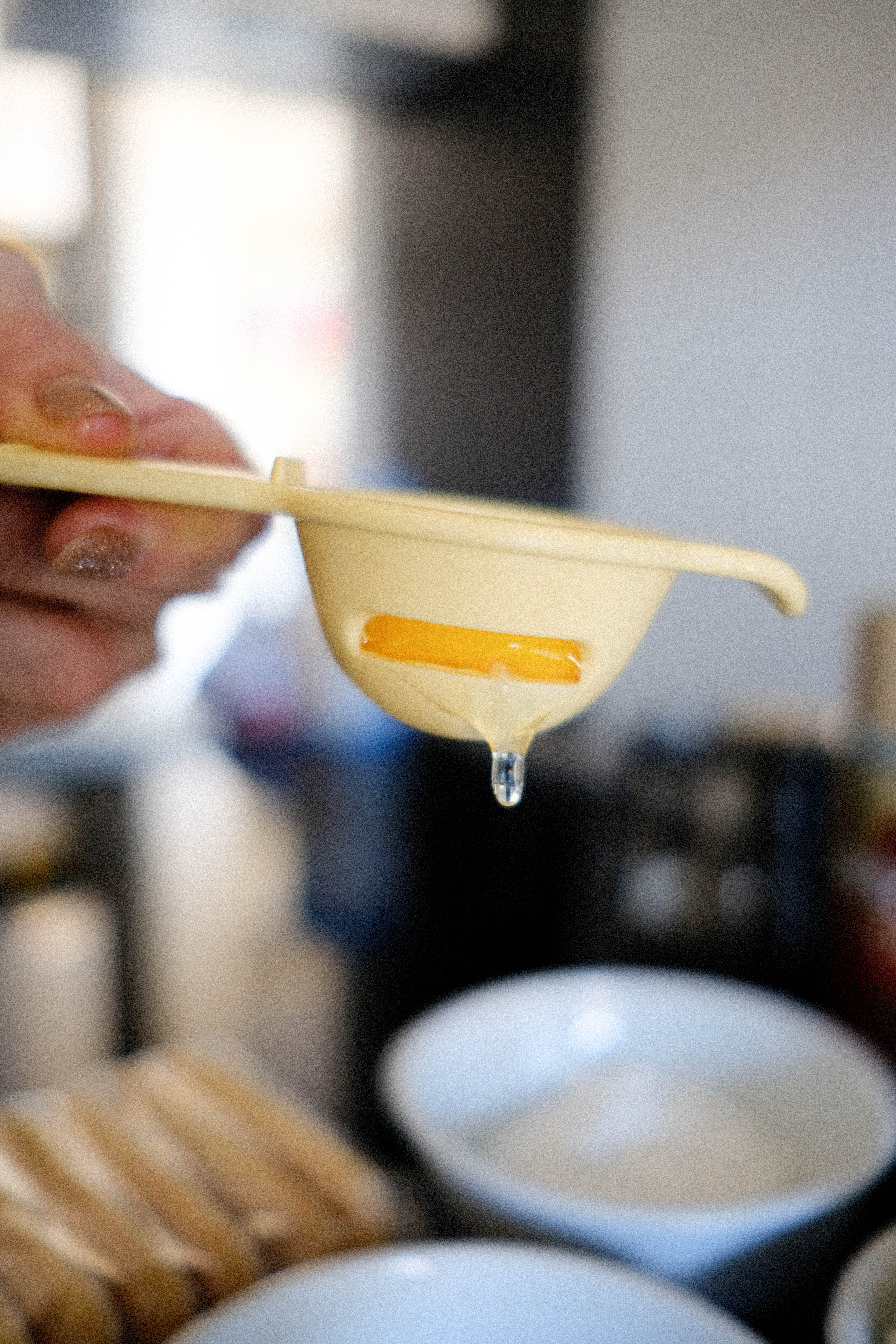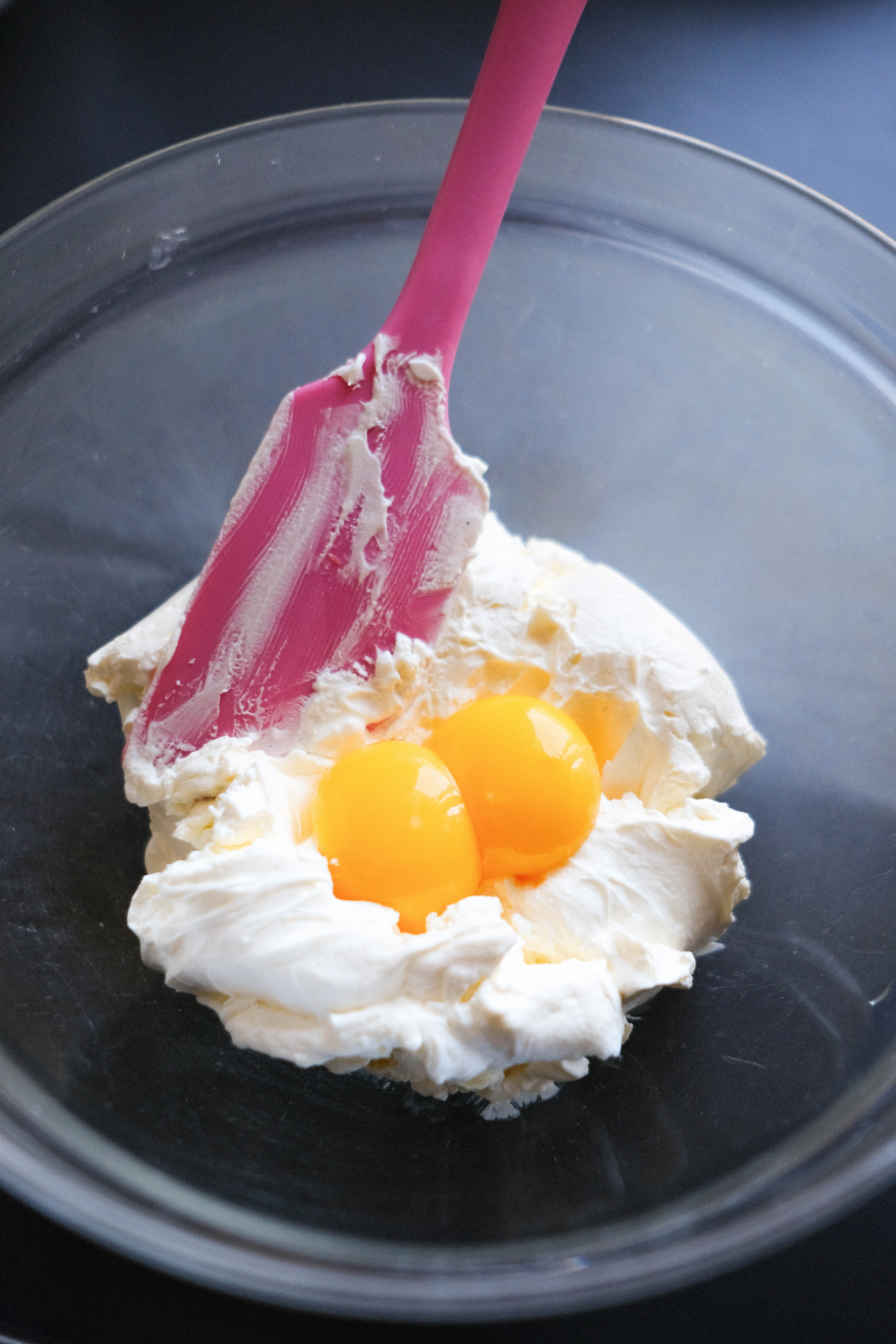 - Scoop out the mascarpone from its tub and put it in another bowl. Add the two egg yolks and sieve the icing sugar over the top.