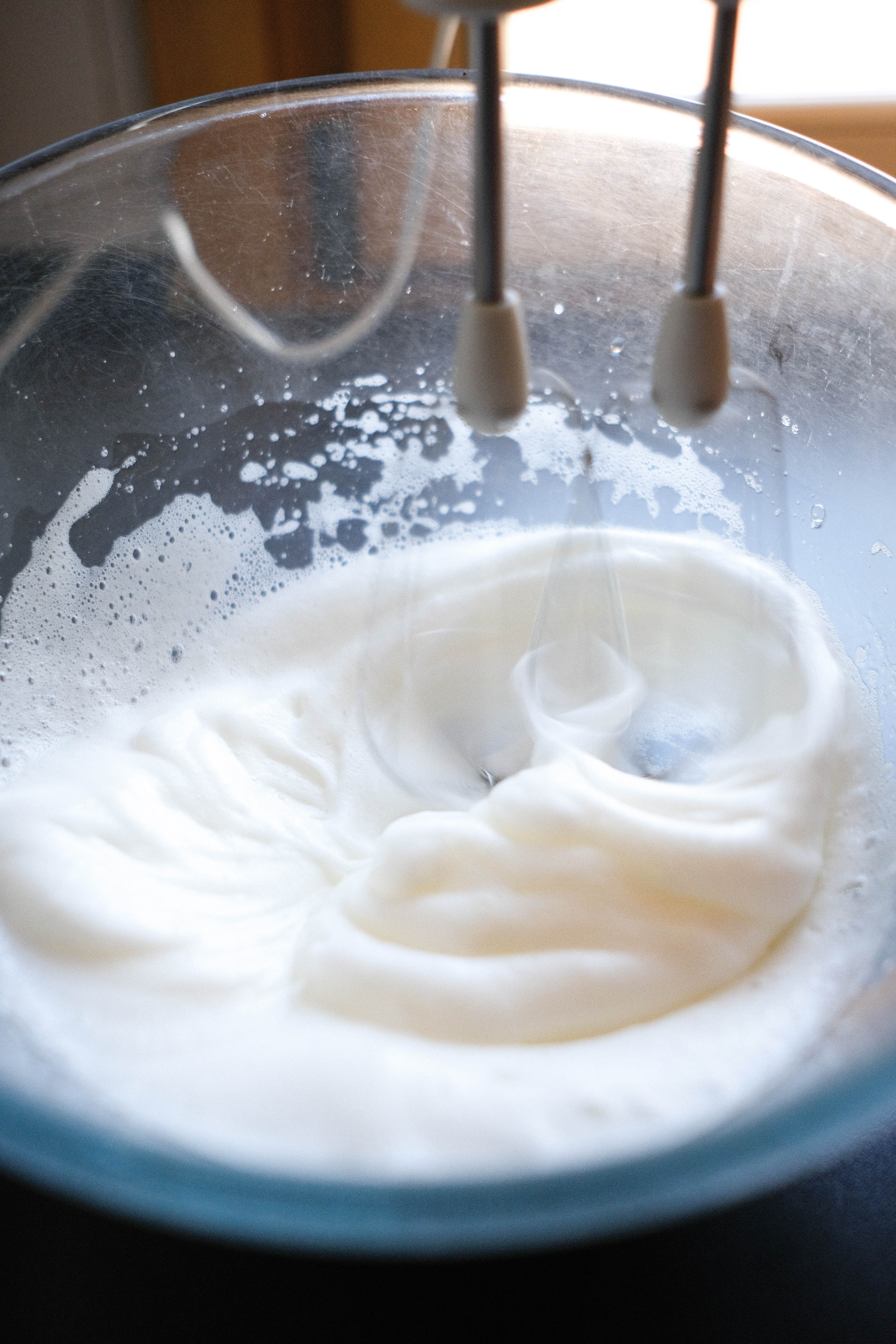 - Break the eggs and separate the whites from the yolks. Then put the whites in a large bowl and whisk them until they become snow white and make stiff peaks in the bowl.