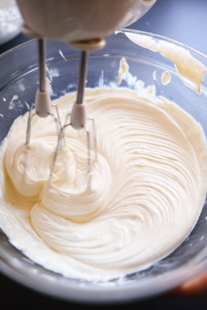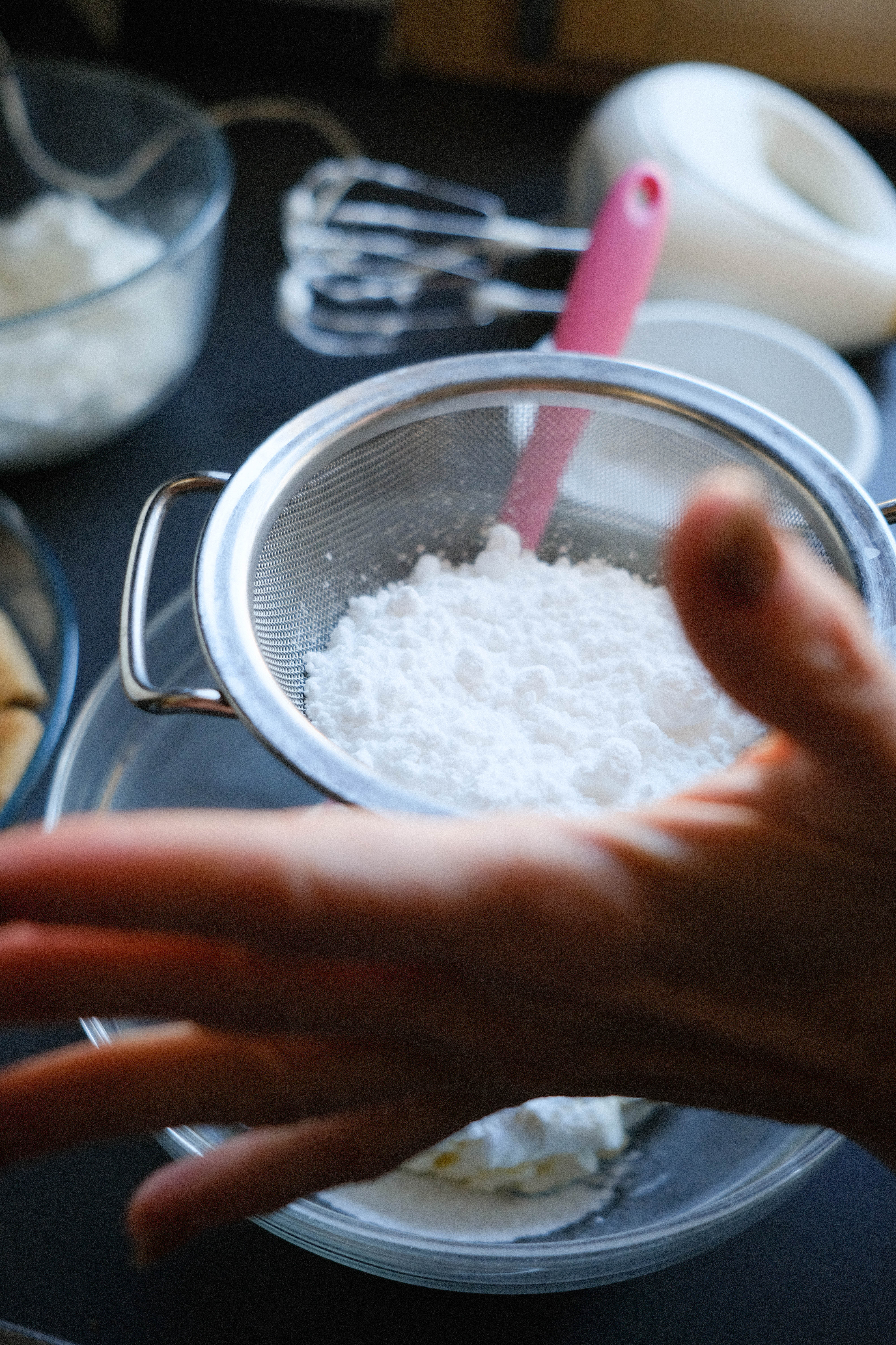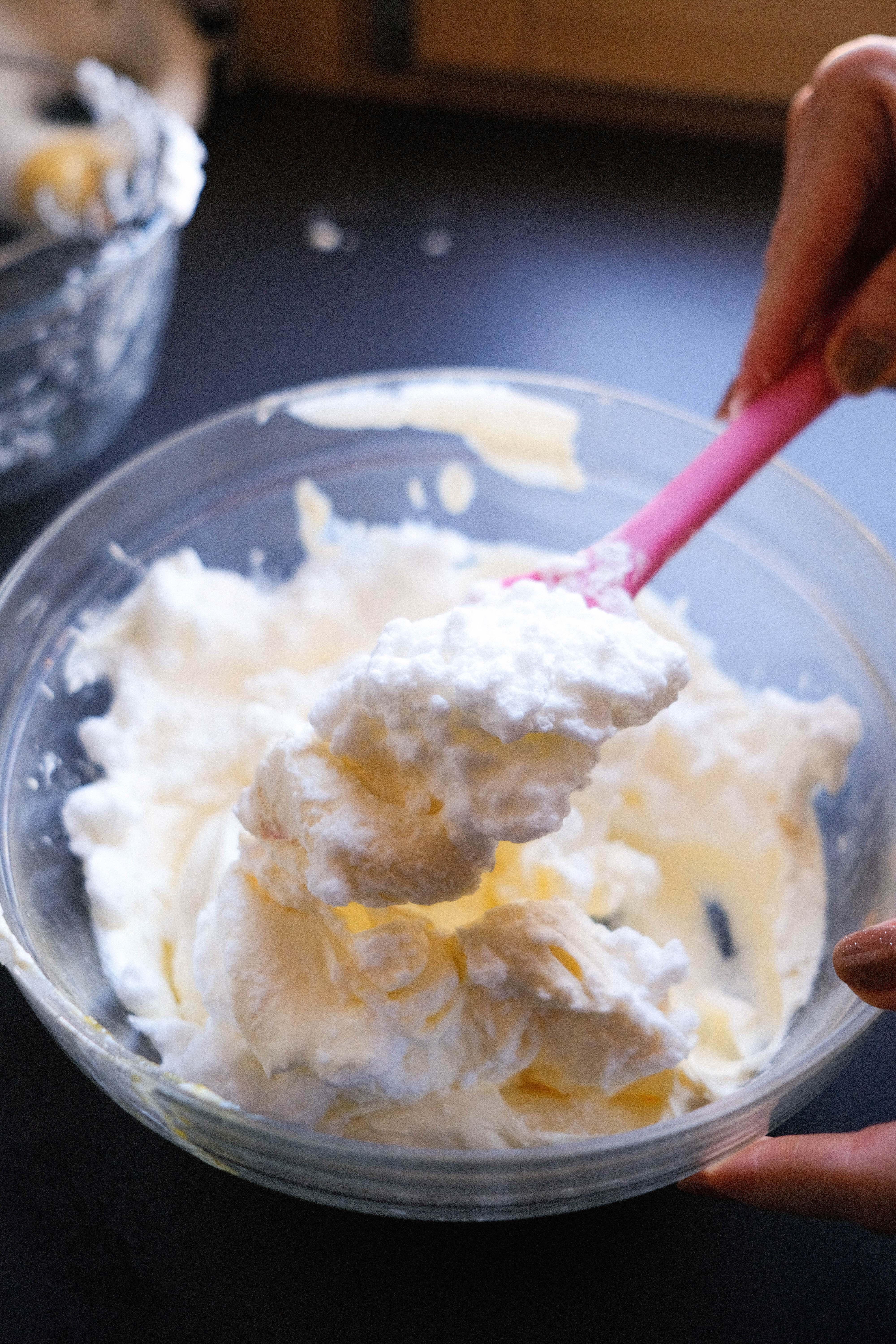 - Now gently fold the egg whites into the mascarpone cream so as the whites don’t lose their air and fluffiness.