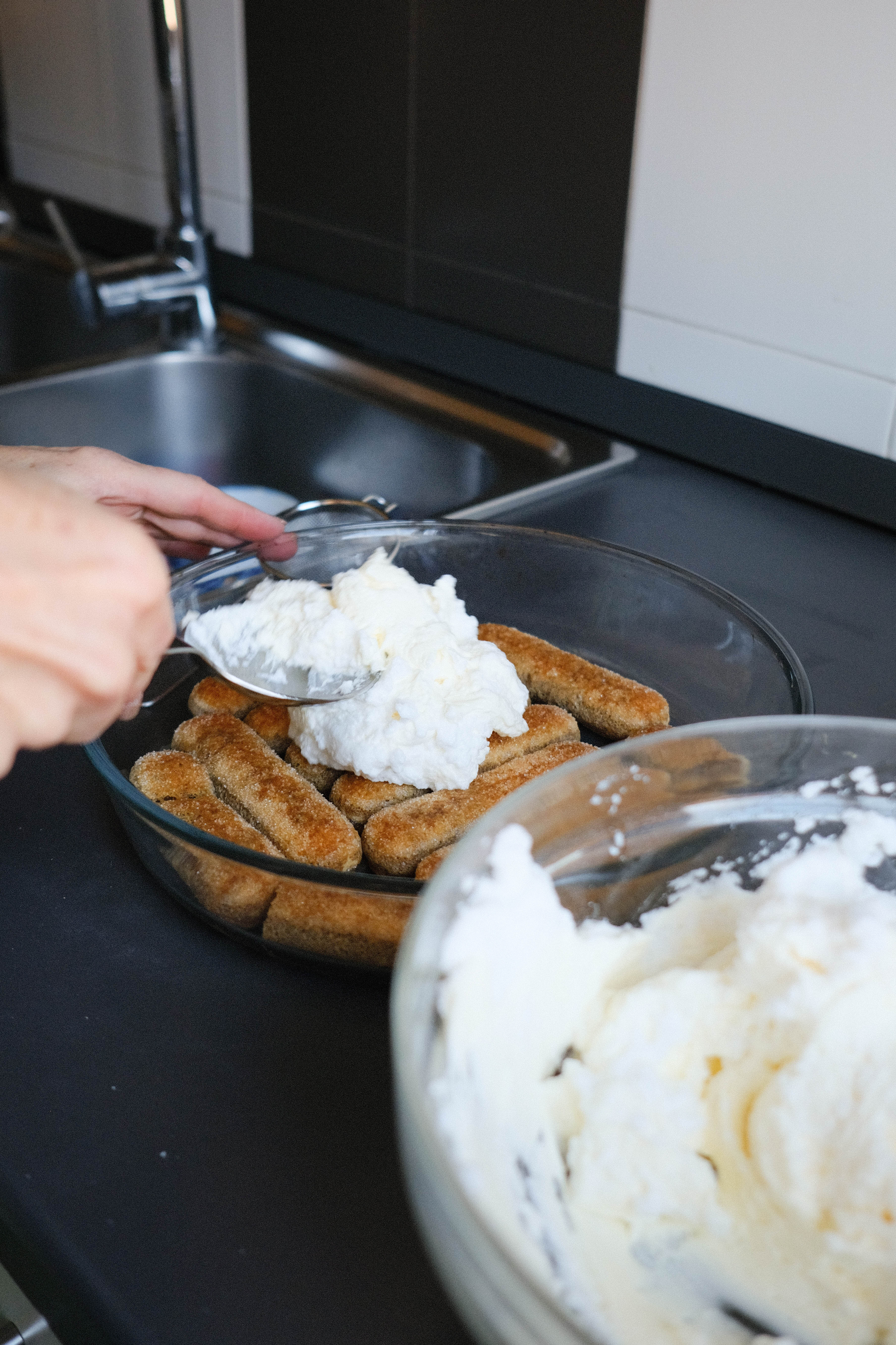 - Spread half of the mixture over the Savoiardi biscuits in the dish.