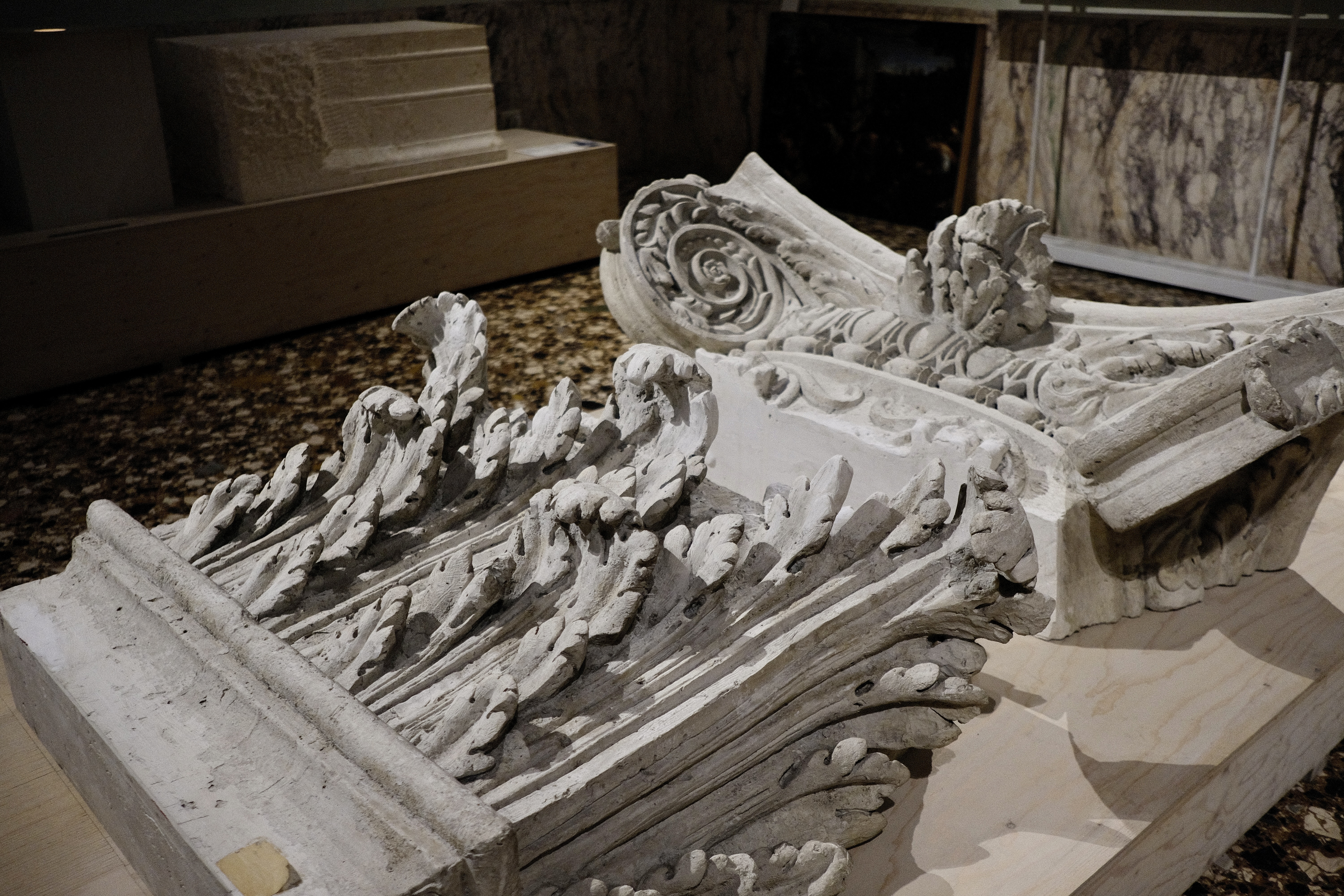 On the floor there is a cast of a Corinthian capital (the fancy top that sits on a column). You can see all the details of the curling acanthus leaves and wonder how someone could ever carve this from solid stone.