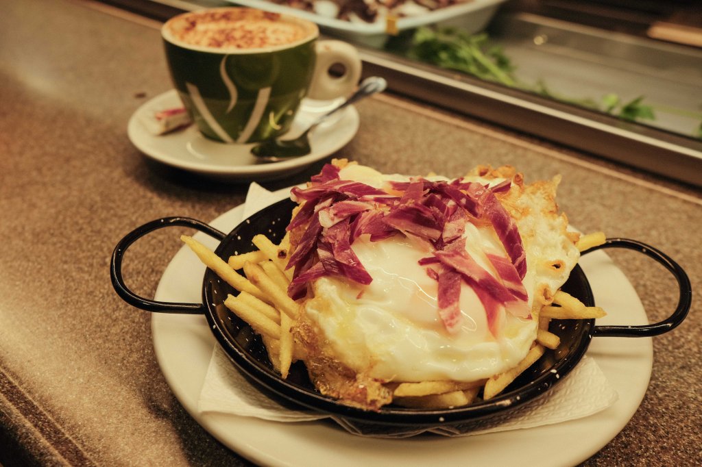 we headed for EL MITIC bar inside the market and we had coffees and shared a dish of huevos con jamón iberico: two fried eggs with runny yolks topped with