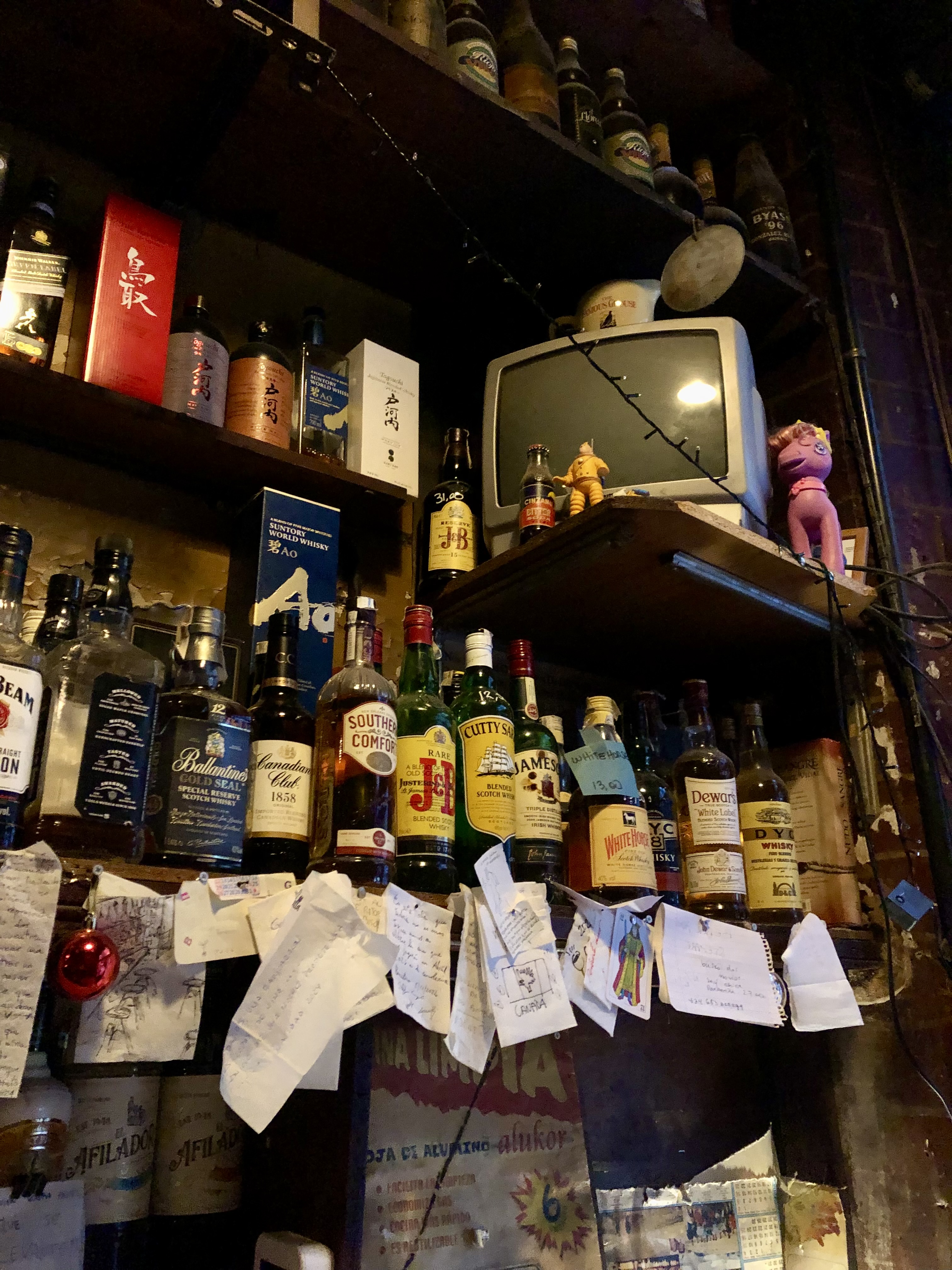 Our bar of choice was BODEGA MARIN. Dark, small and atmospheric. The walls were stuffed with bottles of wine and spirits and decorated with the odd spooky items like plastic dolls and a retro TV set. We had a red vermouth, strong and tasty, served in a small glass with a large ice cube and and an olive.