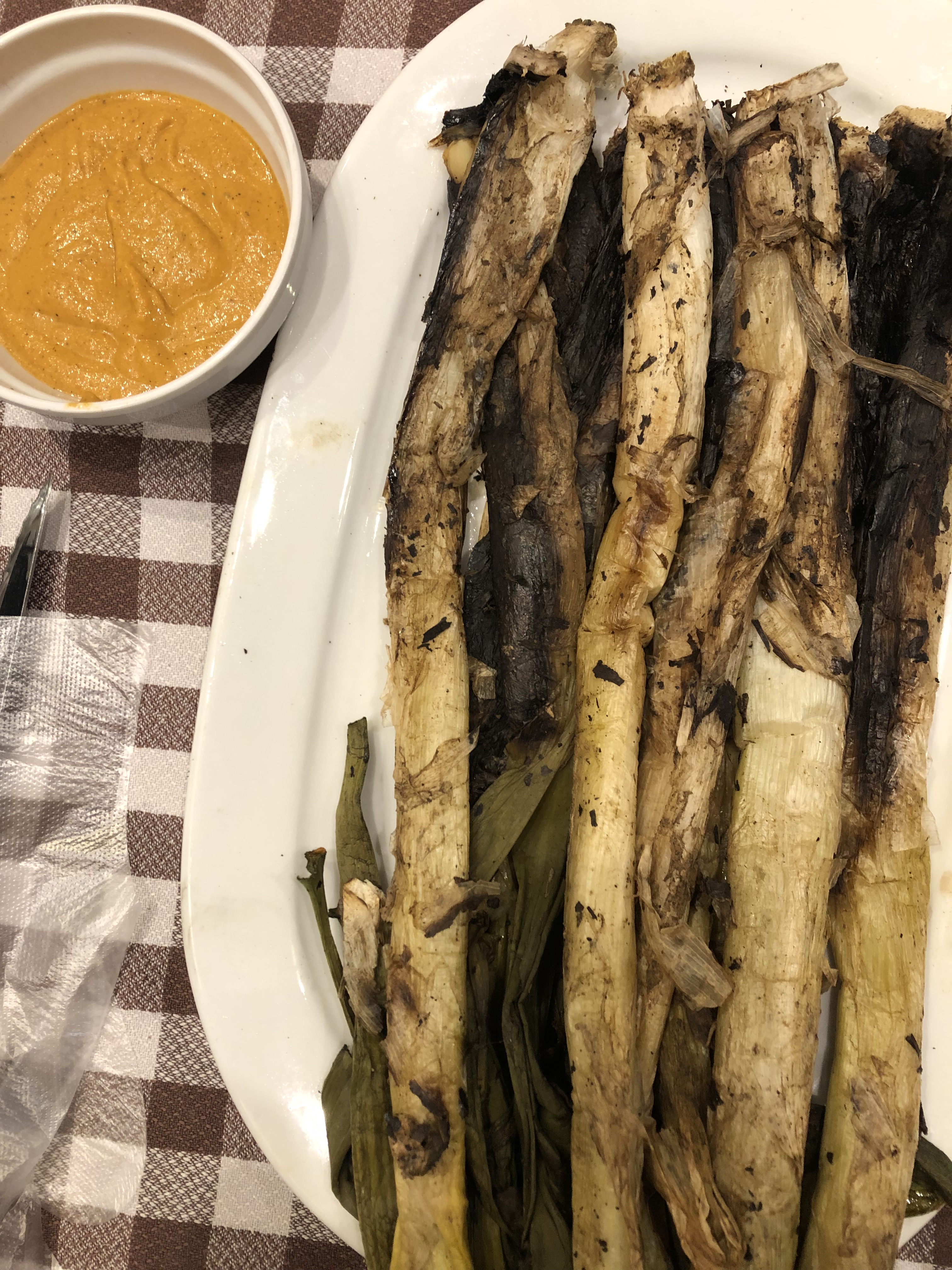This was unexpected, We found ourselves at EL GLOP restaurant for dinner whose seasonal speciality turned out to be CALÇOTS, extra large spring onions which are thrown on the grill in huge bunches and cooked till they’re charred.