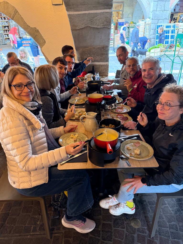 Our stay for two nights was in this big hotel complex about 20 minutes’ drive from Annecy up a winding road which crossed over an old and narrow stone bridge- at which point everyone held their breath and blessed Renzo for his skilful driving.