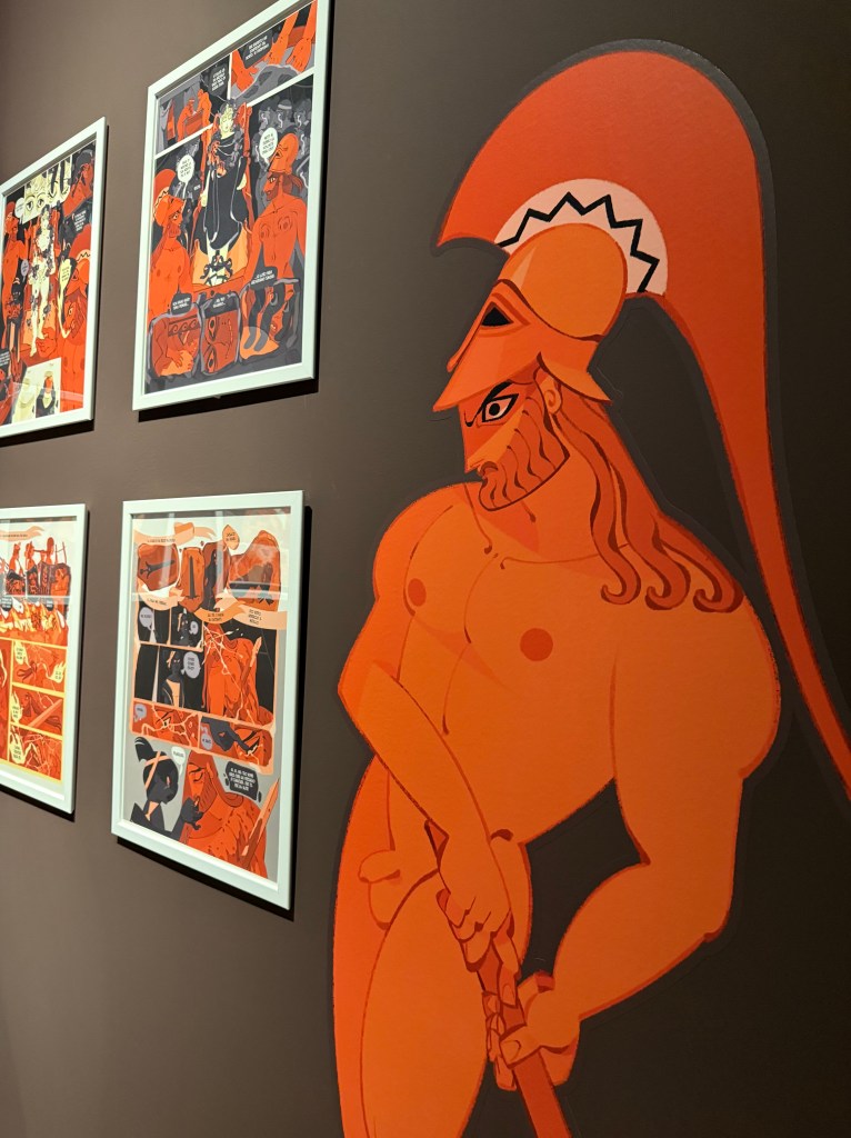 Great themes of literature elaborated in the Greek myths are brought to life in the form of comic strips. The same colours of orange and black as we see on the Greek vases are repeated here. Each character from the myths connects to a theme: